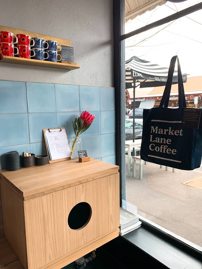 그중에서도 나의 취향을 제대로 저격한 카페는 마켓 레인 커피(Market Lane Coffee)였다. 커피 맛은 물론 도심 곳곳의 지점마다 각각의 특색을 살린 고유의 분위기, 감각적인 디자인 요소들, 친절한 직원까지 모든 게 완벽했다. 설렘을 안고 도장 깨기 하듯 다양한 지점들을 두루 방문했는데, 그중 사우스 멜버른 지점은 내게 기분 좋은 첫인상을 만들어 준 곳이었다. 아담하지만 알찬 카페 공간은 카페의 로고가 큼지막하게 박힌 에코백이 인테리어의 한 부분을 담당하고 있었다. 이미 사 놓고도 빛을 보지 못한 에코백이 집에 한가득이지만 어쩐지 이곳의 에코백만큼은 꼭 사야 할 것 같다는 마음의 소리를 진정시키며 진열된 가방을 잠시 바라보았다. 그러다 애써 못 본 척 시선을 거두고 구매욕을 참는 데 성공했다. 하지만 지금 내가 이 에코백에 관한 이야기를 구구절절 늘어놓는 이유는, 이러한 내 찰나의 번뇌(?)를 기가 막히게 간파한 나의 후배가 이튿날 내게 바로 '그 가방'을 깜짝 선물로 건넸기 때문이다. 그렇다. 이것은 내가 사고 싶되 사지는 않았으나, 결국엔 내게로 오게 된 운명적인 물건에 관한 이야기다.