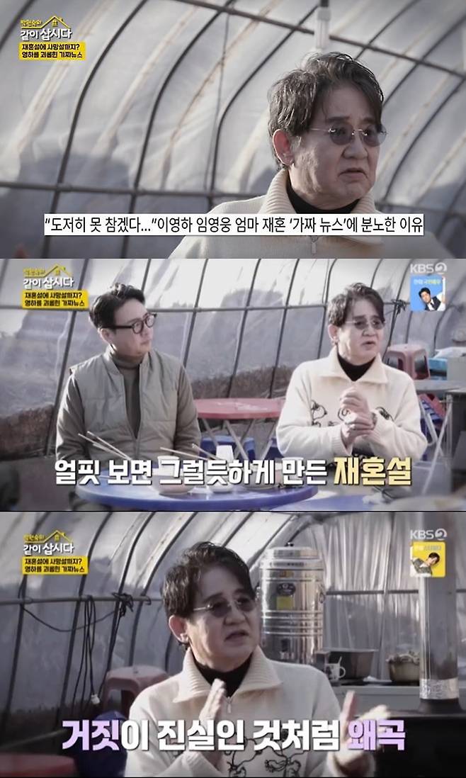 이영하는 재혼설에 대해서도 언급했다. 그는 "대한민국에서 제일 유명한 가수(임영웅)의 엄마와 이영하가 결혼을 했다는 가짜뉴스에 동영상까지 있더라. 결혼식장에 손잡고 입장하는 것처럼 묘하게 만든다. 가짜가 진실인 것처럼 왜곡돼서 지쳤다"라고 털어놨다.