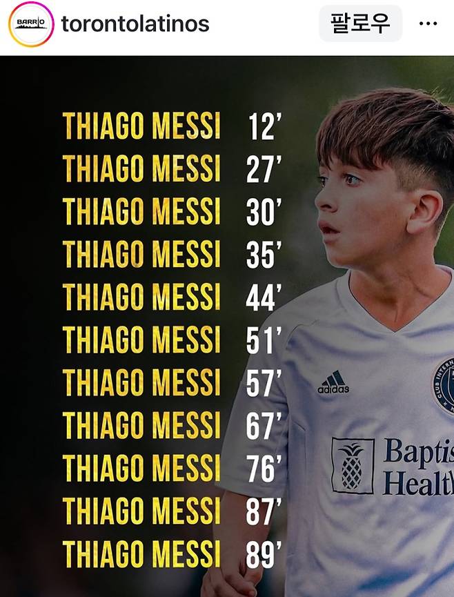 매체는 "발롱도르 8회 수상에 빛나는 메시의 아들 티아고가 최근 치러진 U-13 경기에서 놀라운 공연을 펼쳤다. '비인스포츠'에 따르면 마이애미는 이날 12-0 승리를 거뒀는데 그중 티아고가 11골을 집어넣었다"라고 전했다.