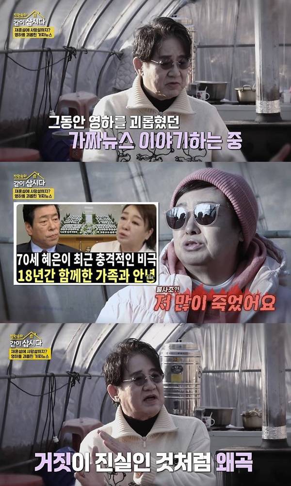 이영하는 가수 임영웅의 모친과 재혼한다는 가짜 뉴스까지 있었다면서 "가짜가 진실인 것처럼 왜곡된다. 너무 싫다"라며 불쾌감을 드러냈다.