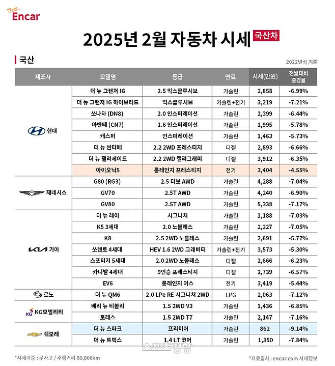 엔카닷컴이 2025년 2월 중고차 시세 공개 자료를 보면 2월 국산차와 수입차 주요 모델 시세는 전월 대비 평균 6.86% 하락했다.