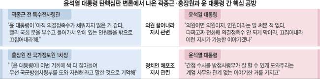 윤석열 대통령 탄핵심판이 다음 주 2차례 변론기일만 남겨두는 등 막바지로 향하고 있지만 12·3 비상계엄 사태의 실체를 확인하기보다 진실공방만 더 가열되는 모양새다. 윤 대통령이 ‘의원을 끌어내라’고 지시해 국회 무력화를 시도했다고 줄곧 증언해온 곽종근 전 특수전사령관과 ‘정치인 체포 의혹’을 처음 폭로한 홍장원 전 국가정보원 1차장과 직접 갑론을박을 벌이기도 했다.