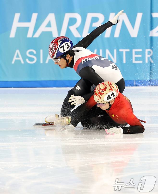 (하얼빈(중국)=뉴스1) 이승배 기자 = 7일(현지시간) 중국 헤이룽장성 하얼빈 빙상훈련센터 다목적홀에서 열린 하얼빈 동계아시안게임 쇼트트랙 남자 500m 예선에서 김태성이 중국 리우 샤오앙과 충돌하며 넘어지고 있다. 2025.2.7/뉴스1