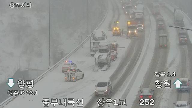 오늘(7일) 새벽 5시 30분쯤, 충북 음성군 감곡나들목 근처 중부내륙고속도로에서 양평 방향으로 가던 자동차 운반 차량이 눈길에 미끄러졌습니다.