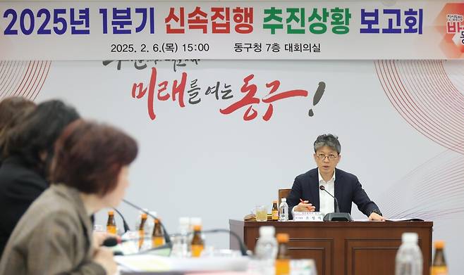 대전 동구는 6일 동구청 대회의실에서 조성직 부구청장 주재로 사업 부서장 등 간부 공무원 30명이 참석한 가운데 지역경제 활성화를 위해 1분기 신속집행 목표액 453억원을 집행하는 '2025년 1분기 신속집행 추진상황 보고회'를 개최하고 신속집행 실적 제고를 위한 방안을 점검했다고 밝혔다.