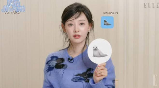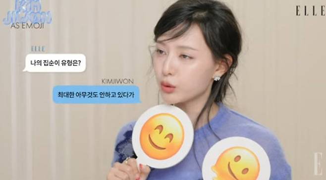 영상에선 김지원이 질문에 이모지로 답하는 모습이 담겼다. “사람들이 보는 나와 내가 보는 나”라는 질문에 선글라스 이모지를 고른 김지원은 “사람들이 보는 저는 좀 놀림 받을 수도 있는데 그래도 멋쟁이 모먼트가 좀 있다”라고 말하며 웃었다. 이어 제가 보는 저는 “이런 느낌이다”라며 물개 이모지를 선택했다. 김지원은 “바깥에서 예쁘게 꾸며 주실 땐 선글라스 낀 이모지 모습이긴 한데 집에서 뒹굴뒹굴 할 때는 물개 이모지 모습일 때도 많다”라고 털어놨다.