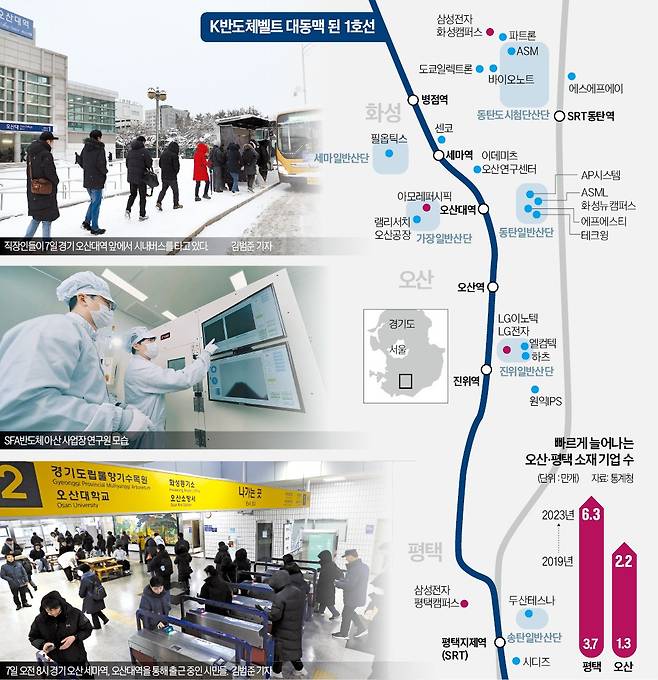 수도권 전철 1호선의 변화는 수원부터 화성(동탄), 평택, 아산으로 이어지는 삼성전자의 반도체 공장이 이끌고 있다. 1호선을 따라 세계 최대 규모의 반도체 제조 벨트가 형성되자 선·후공정을 담당하는 관련 기술 벤처기업도 대거 1호선 라인에 본사 및 연구소, 생산 공장을 배치한 것이다. 소재·부품·장비(소부장)부터 완제품까지 산업의 집적이 가속화하자 본사 및 연구소를 첨단 연구개발(R&D) 인력 유치의 ‘남방한계선’이라고 불리는 판교·기흥에서 1호선 라인으로 옮기는 사례도 생겨나고 있다.
