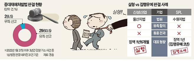중대재해처벌법 사건은 자체 양형기준이 없고, 판사 여러 명이 심리하는 합의부가 아니라 단독판사가 심리하는 것이 원칙이다. 형량의 불확실성이 판사별로 클 수밖에 없다는 평가가 나오는 이유다. 최진원 법무법인 태평양 변호사는 “단독판사 사건은 재판부 성향에 따라 양형에 차이가 날 수 있다”며 “실형 선고는 언제든 나올 수 있다”고 했다.