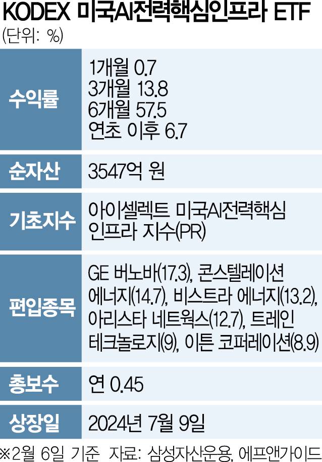 7일 삼성자산운용에 따르면 개인들은 딥시크 효과로 전력 인프라 ETF 가격이 크게 내린 지난달 31일부터 이달 6일까지 이 운용사의 ‘KODEX 미국AI전력핵심인프라’를 368억 원어치나 순매수했다. 전체 ETF 개인 순매수 가운데서도 최상위권 기록이다. 6일 기준으로 올 들어 6.7%, 최근 3개월과 6개월 각각 13.8%, 57.5%의 수익률을 거뒀다.
