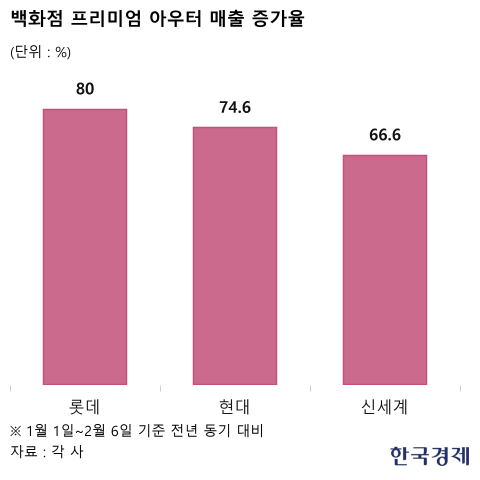 7일 유통업계에 따르면 올해 들어 지난 6일까지 롯데·신세계·현대 등 백화점의 프리미엄 아우터 브랜드 매출이 전년 동기 대비 60~80% 늘었다. 롯데의 매출 증가율이 80%에 달했고 현대(74.6%)와 신세계(66.6%)도 60%를 상회했다.