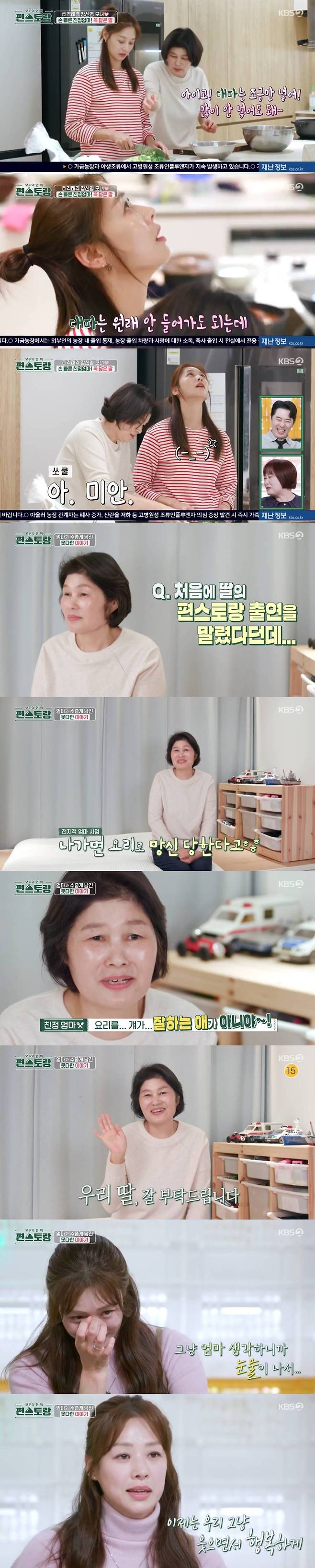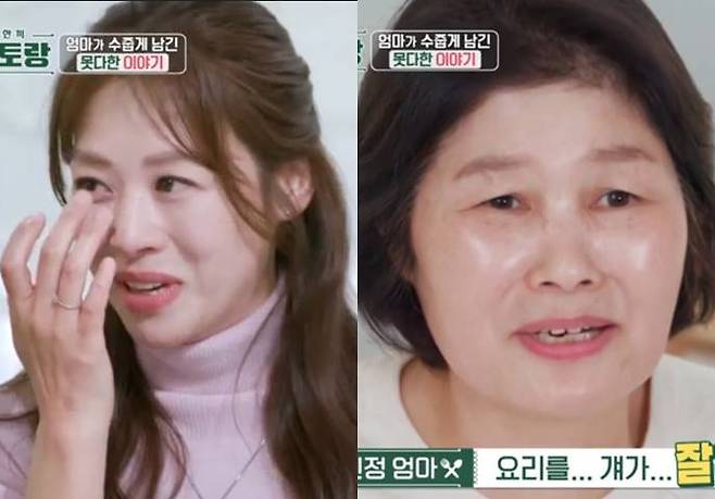(엑스포츠뉴스 이예진 기자) 배우 장신영의 어머니가 음식을 도와주다 실수를 한 뒤 사과를 해 웃음을 안겼고, 딸을 향한 애정을 드러내 먹먹함을 자아냈다.