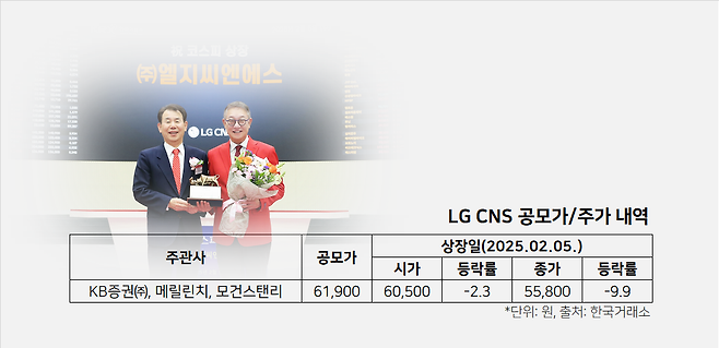 8일 한국거래소에 따르면 LG CNS의 코스피 상장일 종가는 공모가 대비 약 10% 하락한 5만5800원을 기록했다. LG CNS는 줄곧 본질가치 대비 겸손한 몸값을 강조하며 6만1900원으로 상장했으나 시장의 생각은 달랐던 셈이다. 상장 후 사흘이 지났으나 5만7000원선에서 거래됐다.
