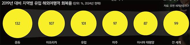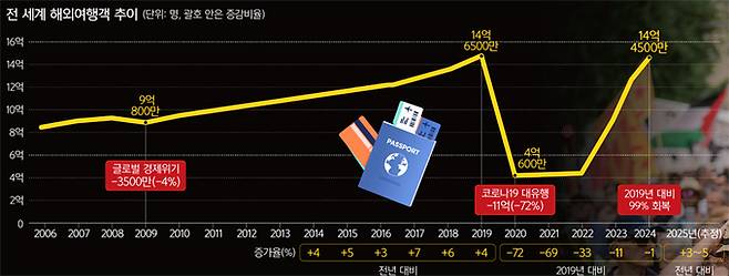 올해도 사정은 크게 다르지 않을 전망이다. 가톨릭에서 매 25년마다 순례객 죄를 사해준다는 희년이어서 바티칸이 있는 이탈리아 로마 방문객이 3500만명선에 달할 전망이고, 유럽의 대표적 관광지 네덜란드 암스테르담은 10월 도시 건립 750주년을 앞두고 각종 행사를 기획 중이다. UNWTO는 경기 침체, 지정학적 갈등 확산 같은 변수가 발생하지 않는 한 올해 해외관광객이 지난해보다 3∼5% 증가할 것이라고 예측했다.