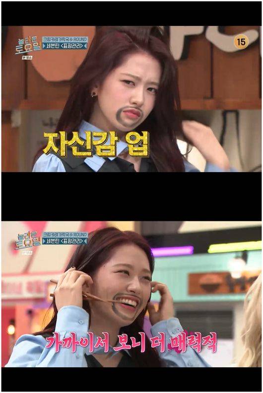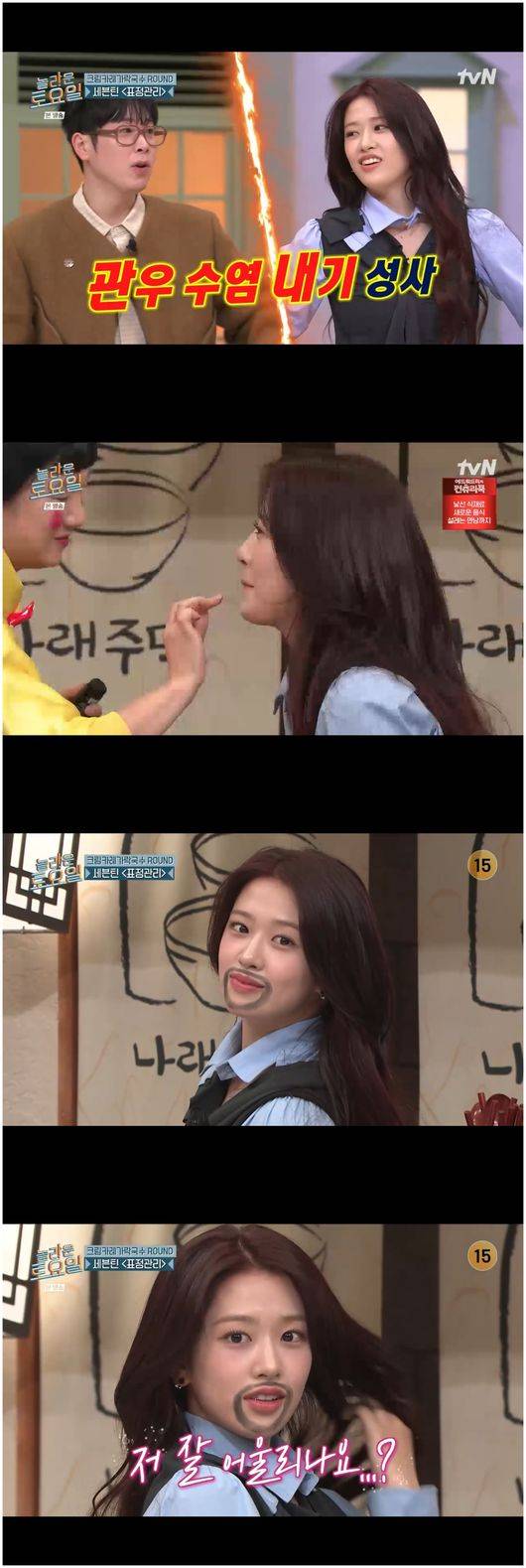 안유진은 주저하는 듯 보였으나, 이내 수염 분장 내기에 응했다.