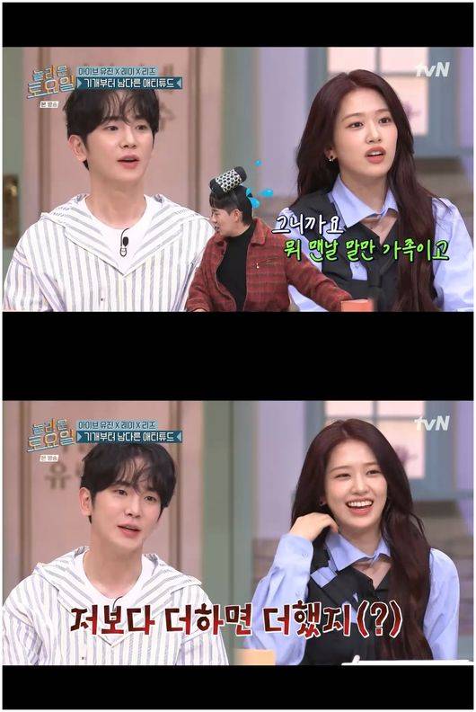 안유진은 “일단 이야기를 하기에 앞서, 벌써 다섯 번이면 한 손가락을 다 채웠는데 오늘 뭐 없냐”라면서 “만날 말만 가족이고, 좀 서운하더라”라고 말해 붐을 당황케 했다. 붐은 “다음에 나올 때는 전용 주차장과 대기실을 드리겠다”라며 센스 넘치게 맞받아쳤다.