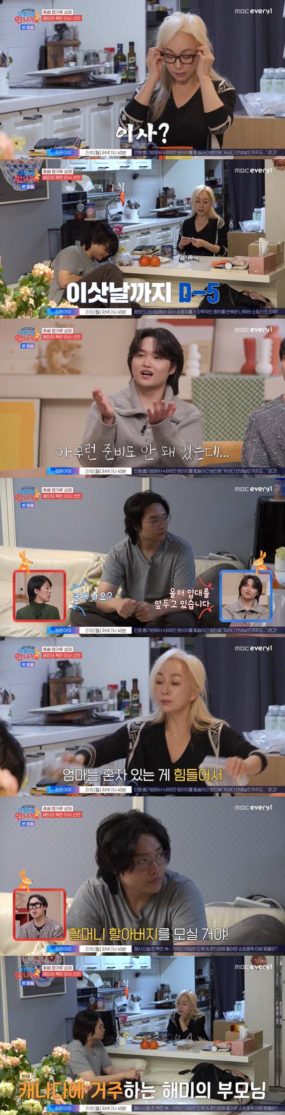 8일 방송된 MBC에브리원·MBN '다 컸는데 안 나가요' 4회에서는 이사를 앞둔 '선후배 캥거루' 박해미X황성재의 일상이 그려졌다.