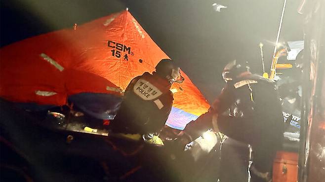 ▲ 구명 뗏목에서 승선원 구조하는 여수해경