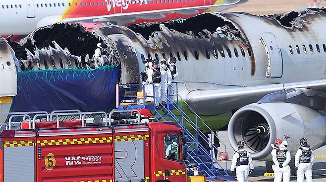 ▲ 3일 오전 부산 강서구 김해국제공항 에어부산 화재현장에서 국토부 항공철도사고조사위원회와 프랑스 항공사고조사위원회, 경찰, 소방 등이 합동감식을 진행하고 있다.