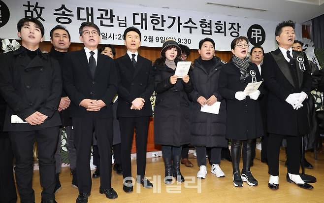 [이데일리 방인권 기자] 고 송대관의 영결식이 엄수된 9일 서울 종로구 서울대학교병원 장례식장에서 태진아, 설운도 등 후배 가수들이 해뜰날을 부르고 있다.