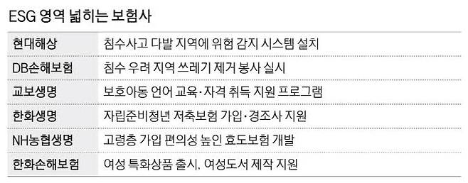 보험사들이 기후변화 대응과 취약계층 지원을 포함한 지속가능 경영 활동을 늘려가고 있다. 본업인 보험에 집중하면서도 침수 사고를 줄이기 위한 시스템을 만들고 취약 청년의 생활 기반을 마련해주는 등 사회에 장기적으로 도움이 되는 행보를 속속 진행 중이다.