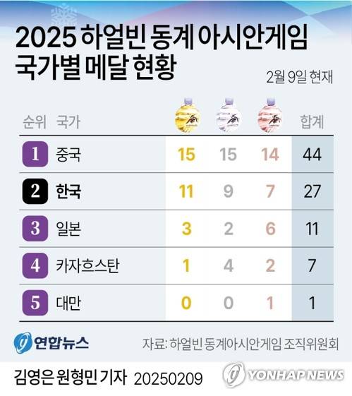 [그래픽] 2025 하얼빈 동계 아시안게임 국가별 메달 현황 (9일)