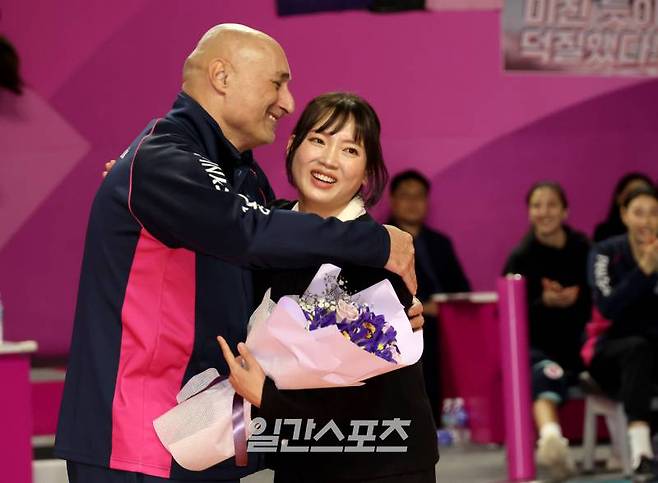 김해란이 은퇴식에서 아본단자 감독에게 꽃다발을 받고 포옹을 하고 있다.