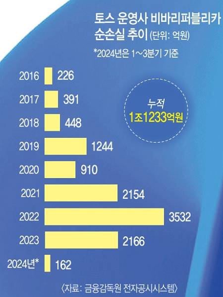 지난 10년간 공격적인 외형 확장은 천문학적인 손실로 이어졌다. 2015년 앱을 출시하며 핀테크 시장에 뛰어든 뒤 2016년부터 2024년 3분기까지 누적으로 1조1233억원의 순손실을 냈다. 2018년까지만 해도 500억원 미만이었던 연간 순손실이 2021년 2000억원, 2022년엔 3000억원을 넘어섰다.