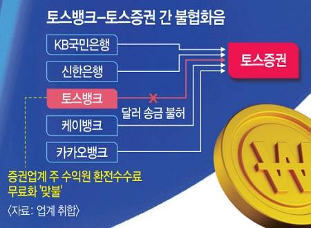 주도권을 쥐기 위한 계열사 사이 자중지란이 벌어지기도 한다. 특히 지주사 격인 비바리퍼블리카 핵심 계열사인 토스뱅크와 토스증권은 서로의 사업 영역을 침범하는 정책을 연이어 내놓으며 충돌하고 있다. 토스뱅크는 지난해 초 외화 환전 수수료를 무료로 제공하는 ‘외화 통장’을 토스증권과 사전 논의없이 출시했다. 환전 수수료는 2023년 기준 17조원을 넘어설 정도로 증권사 입장에서 효자 상품이다. 증권사 수입의 상당 부분을 차지하는 환전 수수료를 같은 계열사인 토스뱅크에서 무료로 풀어버린 셈이다.