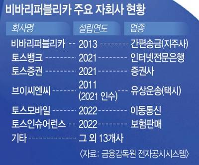 ‘금융을 쉽고 간편하게’ 슬로건을 내세우며 2013년 설립된 비바리퍼블리카는 2015년 간편송금 앱 토스를 출시하며 혁신 아이콘으로 각광받았다. 앱 하나로 시작된 이 회사는 현재 자회사 18개를 거느리고 있다. 계열사 면면을 보면 은행(토스뱅크) 증권(토스증권) 보험(토스인슈어런스) 이동통신(토스모바일) 등 다양한 분야에 발을 걸쳤다.
