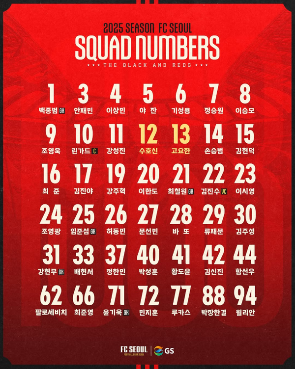 우승을 노리는 서울이 2025시즌 등번호를 발표했다. ‘캡틴’ 린가드를 10번을 받았고, 이밖에도 기성용, 최준, 야잔, 김주성, 강현무 등 핵심 선수들은 기존 번호를 유지했다. 이번에 새롭게 합류한 정승원이 7번, 김진수는 22번, 문선민은 27번, 이한도는 20번을 선택했다.