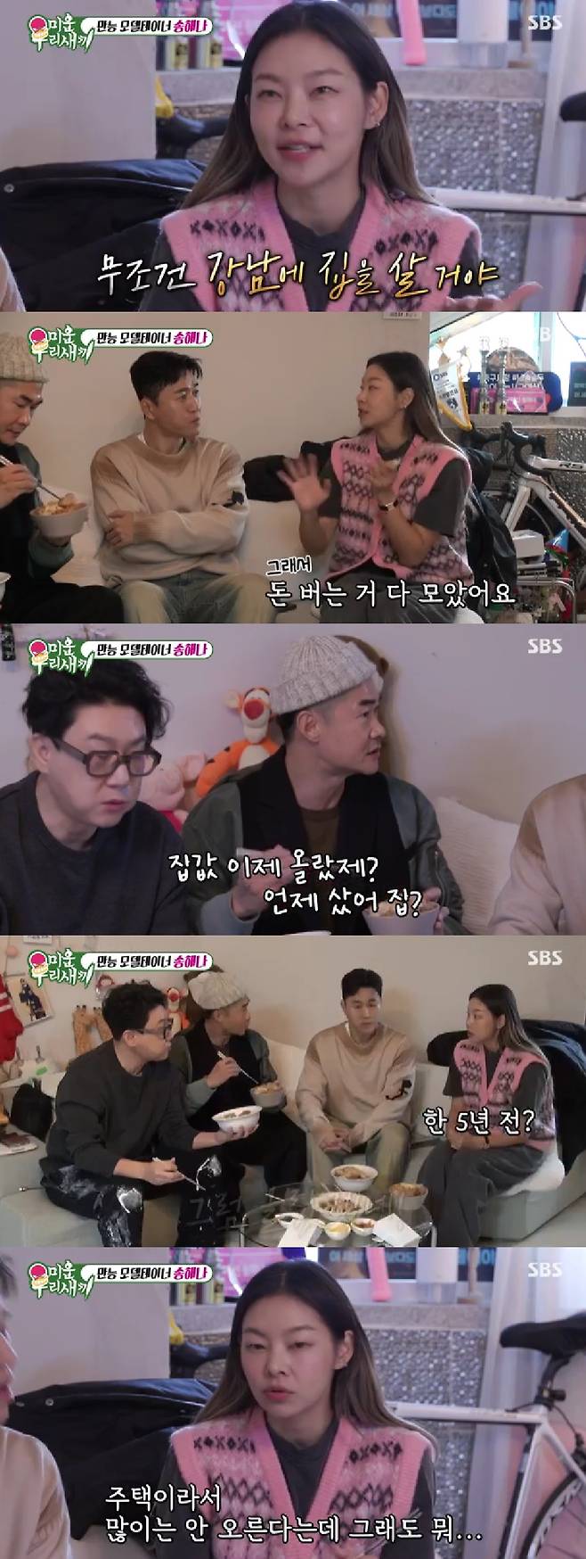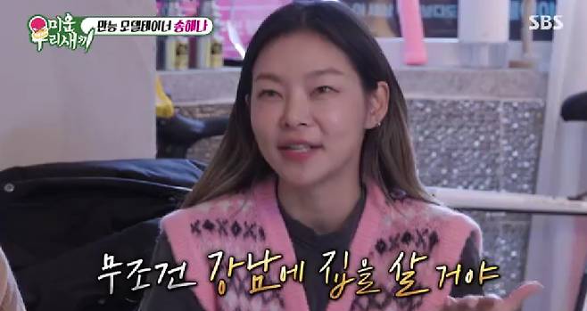스무 살때부터 일을 시작했다는 송해나는 "딱 스무 살 때부터 용돈이 끊겼다. 차도 서른 넘어서 샀다. 무조건 강남에 집을 사는 게 꿈이었다. 돈 버는 거 다 모았다. 대출 꼈는데 다 갚았다"고 뿌듯한 미소를 지었다.