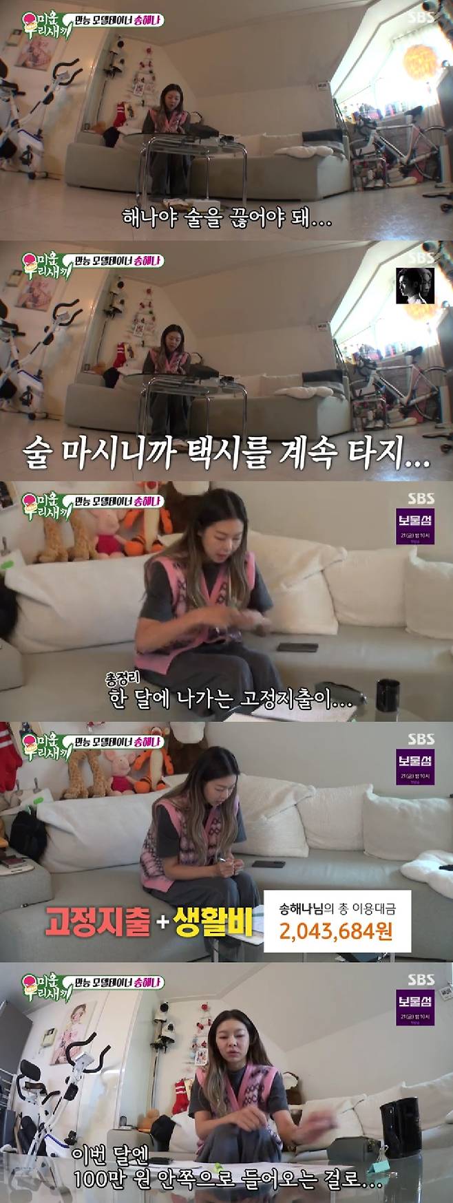 다음으로 술값을 정리하던 중, 한 날에 주류로만 18만 4천원을 쓴 내역을 발견한 송해나는 "술값 줄여야겠다"고 반성했다. 이어서 살펴본 택시비 내역에서는 한 달 택시비로 56,700원을 사용했다. 그는 "술을 끊어야 된다. 술 마시니까 택시를 계속 타는 거 아니냐"고 자조했다.