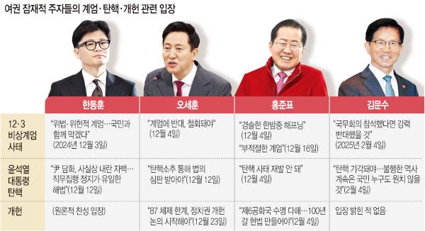 현시점에서 여권 ‘잠룡’으로 불리는 김문수 고용노동부 장관, 오세훈 서울시장, 홍준표 대구시장, 한동훈 전 국민의힘 대표 등은 모두 비상계엄 선포에 대해 부적절했다는 입장을 보인다. 다만 뉘앙스 차이는 있다. 한 전 대표는 계엄 선포 직후 “위헌·위법적 계엄을 막아내겠다”고 밝혔고, 국회의 계엄 해제 요구안 표결을 이끌었다. 오 시장도 당시 “계엄에 반대한다. 철회돼야 한다”는 의사를 밝혔다.