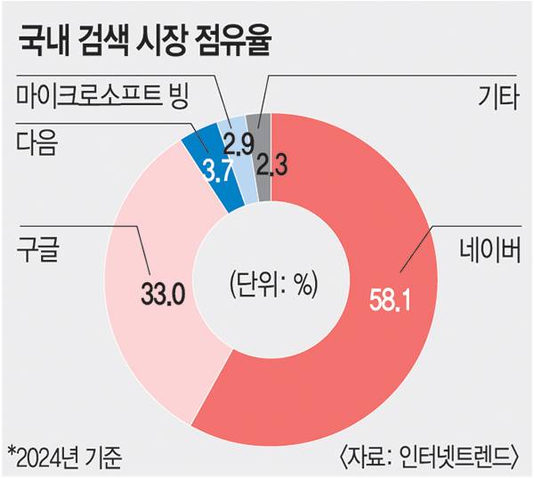 국내 검색 시장에서 네이버 점유율은 9년 동안 약 20%포인트 하락했다. 웹사이트 분석 업체 인터넷트렌드에 따르면 지난해 국내 검색 시장 점유율은 네이버가 58.1%로 1위를 유지했다. 하지만 2015년 78%에 비해 20%포인트나 쪼그라든 성적이다.