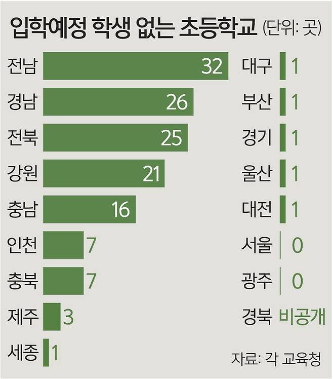 9일 세계일보가 경북을 제외한 전국 16개 시·도교육청에서 받은 ‘2025학년도 초등학교 학급 편성 결과’(안)에 따르면 다음 달 입학 예정자가 한 명도 없는 초등학교(분교 포함)는 16개 시·도에서 143곳으로 집계됐다.