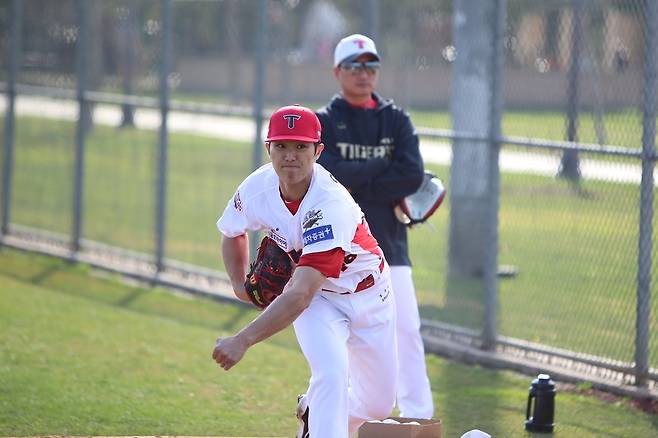 이의리는 8일(현지시간) 미국 캘리포니아주 오렌지카운티 어바인의 그레이트 파크 야구장에서 스프링캠프 다섯 번째 불펜 피칭을 실시했다. 정재훈 투수코치, 이동걸 불펜코치, 박창민 트레이닝 코치가 지켜보는 가운데 구위와 투구 밸런스를 점검했다.
