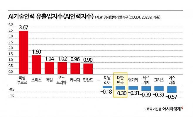 우리나라는 현재 ‘AI 인재 유출국’으로 분류된다. 경제협력개발기구(OECD) 조사에 따르면 2023년 기준 우리나라의 AI 기술인력 유출입 지수는 -0.3으로 집계됐다. OECD 산하 AI 정책관측소가 집계하는 이 지수는 AI 기술인력 1만명당 유출입 수를 기반으로 작성되는데, 값이 0보다 작으면 인력이 유출되고 있다는 걸 의미한다. 지수 집계를 위한 데이터는 구인·구직 전문 소셜미디어 ‘링크드인’을 통해 수집된다. 조사 대상 36개국 가운데 이스라엘, 그리스, 튀르키예, 헝가리에 이어 5번째로 낮다. 반면 인재 유입이 가장 많은 국가는 룩셈부르크, 스위스, 독일 등의 순이었다.