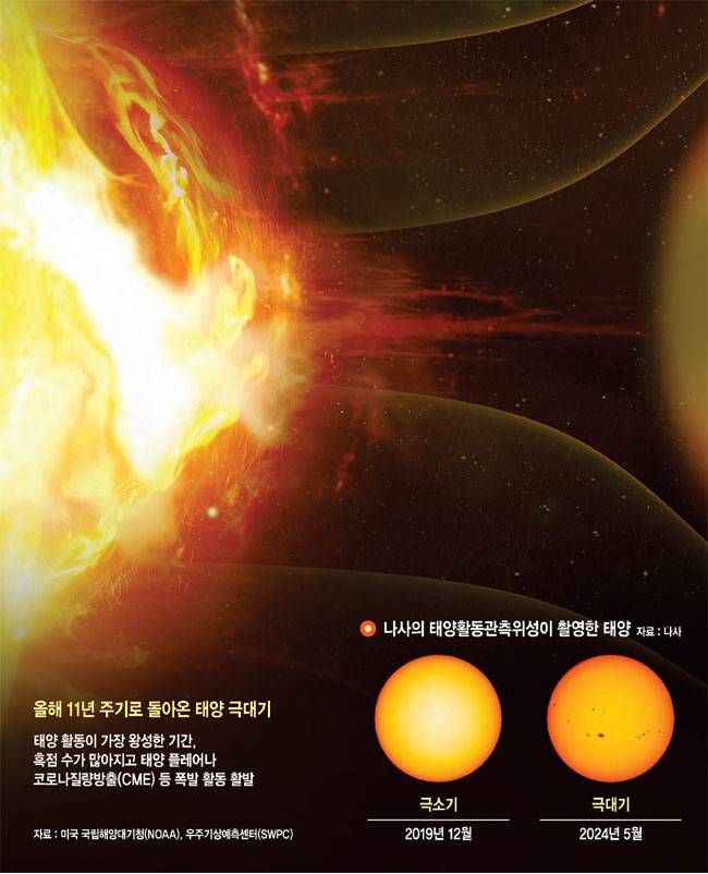 지난해 지구 각지에서 여러 오로라가 관측된 이유도 이와 엮여 있다. 태양 극대기가 가까워지며 흑점 활동이 활발해졌는데, 특히 5월 9~10일 사이 X등급의 플레어가 여러 차례 발생했다. 이어 지구를 향한 CME가 발생했고, 5월 11일 지구에 CME가 도달하며 강력한 지자기 폭풍이 일어났다.