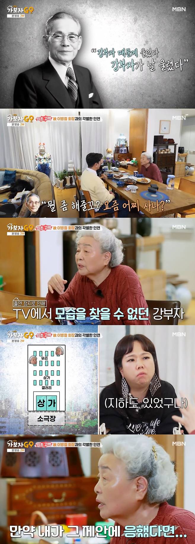 강부자는 "그러다 (이병철 회장이)아무도 안 계실 때 '뭘 좀 해줄까. 요즘 어찌사나' 이러셨다. 출연 정지에 안 나오니까 강부자가 굶는 줄 알고. 그래서 저 잔 산다고 걱정 말라고 했다"라고 고백했다.
