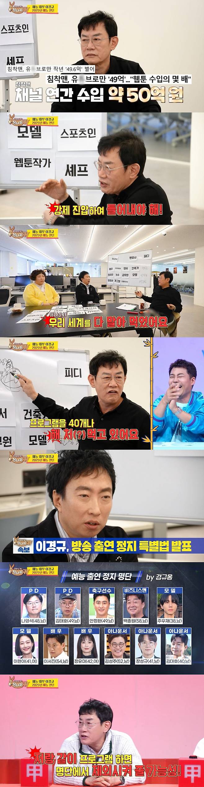 이어 이경규는 개인적인 출연 정지 명단을 발표하며 "실명을 공개함으로써 파란을 일으키고 싶다. 명단 공개했는데 방송에 출연한다면 가택 연금에 들어간다"고 말해 웃음을 안겼다. 이경규가 선정한 예능 출연 정지 대상은 나영석, 김태호, 안정환, 백종원, 주우재, 이현이, 이서진, 정유미, 김성주, 장성규, 김대호 총 11명.