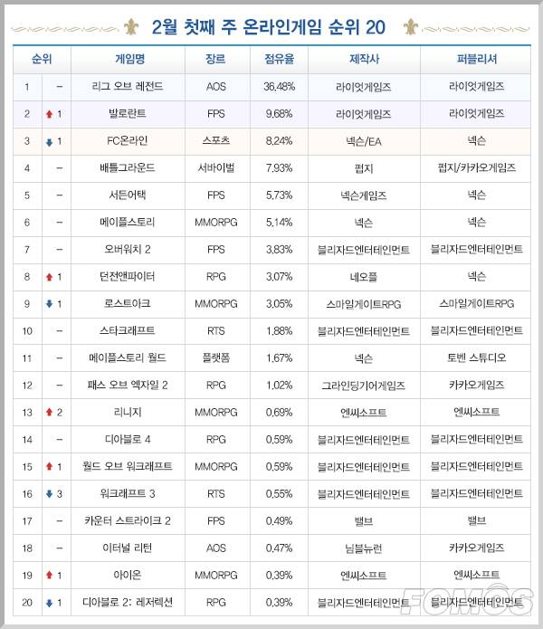 지난 3일부터 9일까지 게임트릭스에 집계된 PC방 온라인 게임 이용시간은 전주 대비 25.8% 감소한 것으로 나타났다. 설 연휴 효과가 사라지면서 대부분 이용시간이 줄었고, 감소 폭에 따른 순위 변동이 발생했다.