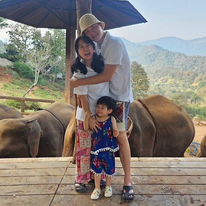 공개된 사진 속 홍현희는 남편 제이쓴, 아들 준범이와 다 같이 꼭 끌어안은 채 화목함을 자랑했고, 뒤로 자리한 코끼리들이 눈길을 끈다.