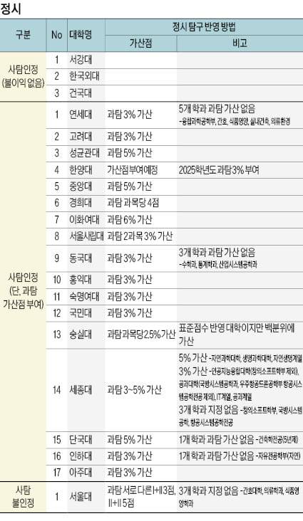 정시에서 자연계 학과이지만 사탐 과목이 인정되면서 불이익도 없는 대학은 서강대, 건국대, 한국외대다. 사탐 과목을 자연계 학과에서 인정하지만 과탐 과목 응시자에게 가산점을 부여하는 대학은 연세대다. 연세대 자연계 학과 내에서도 융합과학공학부, 간호, 식품영양, 실내건축, 의류환경학과 등 5개 학과에서는 불이익이 없다. 고려대·성균관대·한양대·중앙대·경희대·이화여대·서울시립대·동국대·홍익대·숭실대·국민대·숙명여대·세종대·단국대·인하대·아주대 등에서는 과탐 과목에 3%, 크게는 6%까지 가산점을 준다.