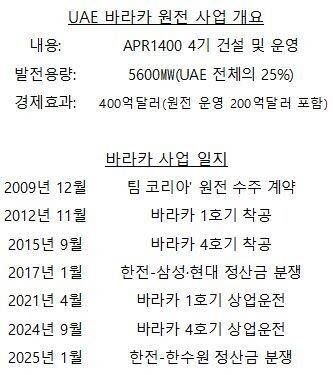 이명박 정부 시절인 2009년 12월 한국이 바라카 신규 원전 4기의 최종 사업자로 선정된 뒤 정부가 밝힌 경제 효과입니다. 당시 이명박 대통령은 기자회견에서 “한국은 국운이 있다”며 바라카 원전 수주를 “건국 이래 사상 최대 플랜트 수출”이라고 자평했습니다. 당시 바라카 원전 입찰엔 한전이 연합체(컨소시엄)를 꾸려 참여했습니다. 원전 시공 경험이 더 많은 한수원 대신 국내외 브랜드 파워가 더 큰 한전을 전면에 내세우는 전략이었습니다. 한전이 계약을 따내고 주요 사업인 시공과 시운전 등을 하청 주는 방식은 정산금 분쟁의 단초가 됐습니다.