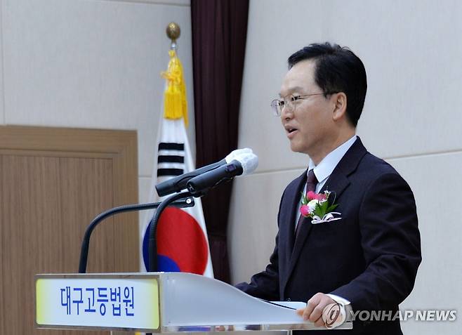 (대구=연합뉴스) 김선형 기자 = 진성철 신임 대구고법원장이 10일 대구고등법원에서 열린 취임식에서 인사말을 하고 있다. 2025.2.10 [대구고법 제공. 재판매 및 DB 금지]