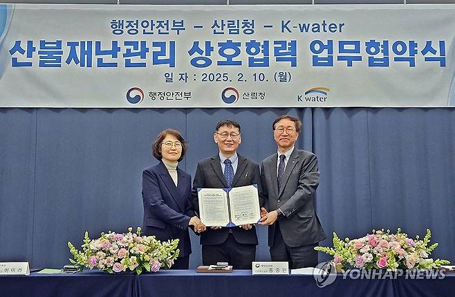 (대전=연합뉴스) 홍종완 행정안전부 사회재난실장(가운데)과 이미라 산림청 차장(왼쪽), 류형주 한국수자원공사 부사장이 10일 대전시 대덕구 한국수자원공사 대청댐지사에 '산불 관리 협력 강화를 위한 업무협약'을 체결하고 기념 촬영을 하고 있다. 2025.2.10 [산림청 제공. 재판매 및 DB 금지]