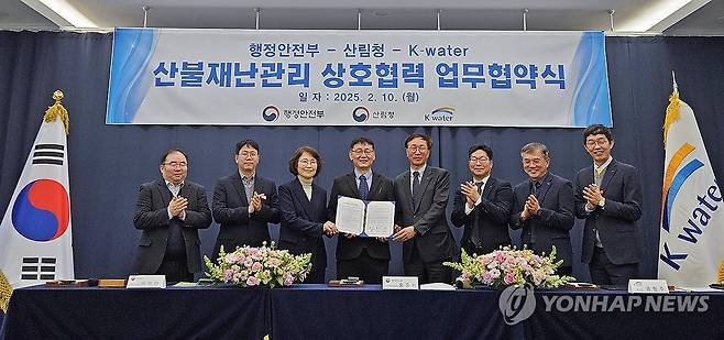 (대전=연합뉴스) 홍종완 행정안전부 사회재난실장(왼쪽 네 번째)과 이미라 산림청 차장(왼쪽 세 번째), 류형주 한국수자원공사 부사장( 오른쪽 네 번째) 등이 10일 대전시 대덕구 한국수자원공사 대청댐지사에서 '산불 관리 협력 강화를 위한 업무협약'을 체결하고 기념 촬영을 하고 있다. 2025.2.20 [산림청 제공. 재판매 및 DB 금지]