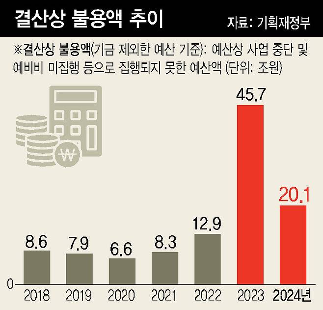 지난해 대규모 세수 결손 등에 따라 발생한 20조원 남짓 불용(예정된 지출을 하지 못한 세출액)은 정부의 경기 대응력이 심각하게 훼손된 핵심 원인이다.