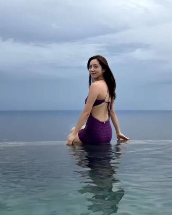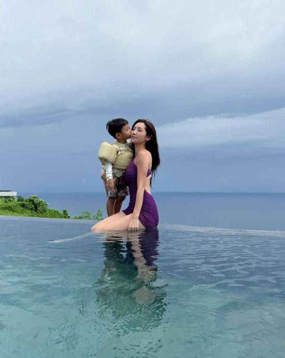 등이 훤히 드러난 보라색 수영복을 입고 수영장에 걸터앉아 포즈를 취했다. 또한 자녀와 함께 애정 표현을 하는 모습도 눈길을 끌었다.