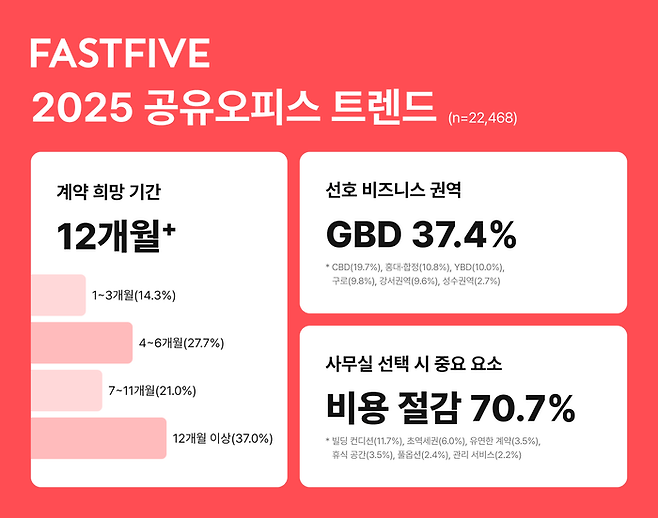 패스트파이브가 지난해 신규 인입된 고객 빅데이터 2만2468건을 분석하여 '2025 공유오피스 트렌드'를 11일 발표했다.